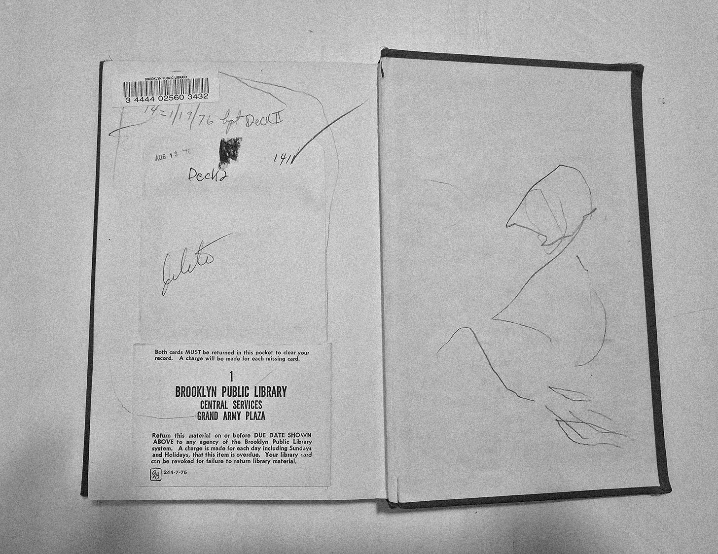 True to its rating, this is a rough ex-library book, likely culled from the stacks due to low demand. But the book had been read, sometime, a lot. The corners are worn, the pages are marked, the binding a bit loose. There are stickers indicating that it was once the property of the Brooklyn Public Library. The library card pouch is glued to the back page, alongside what looks to be a child’s pencil scribbling. A “Storage” sticker is pasted over the reference number on the binding, a badge of fate. The book came to the Booklyn Library sometime in the mid 70s, based on the stamps near the card pouch. The fine edition I passed up would have had no signs of the trail this book had traveled.
